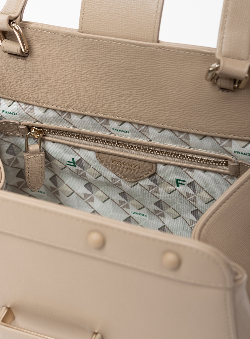 The technical virtuosity and the attention to detail that distinguish every Franzi creation have given life to an extremely versatile model, perfect for a daily use, that can be carried by hand, on the arm, and cross-body, thanks to the adjustable leather shoulder strap.