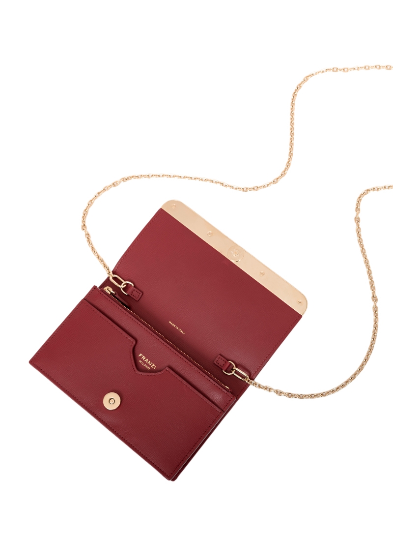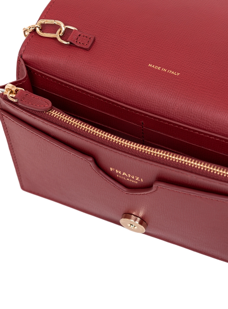 Luisa - Wallet on Chain in Cuoio Franzi Calfskin in Bordeaux is a small and extremely versatile handbag that features many of the brand's iconic elements. The Wallet on Chain can be used both as a daytime accessory and as an elegant evening clutch. In this new model, the brand's refined aesthetic is combined with practicality. Details such as the golden bar with rivets and the metal chain shoulder strap enrich the design, while a series of convenient pockets and compartments ensure functionality