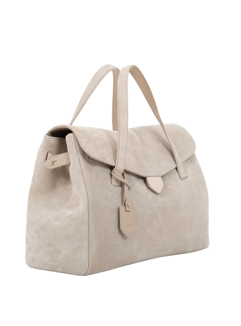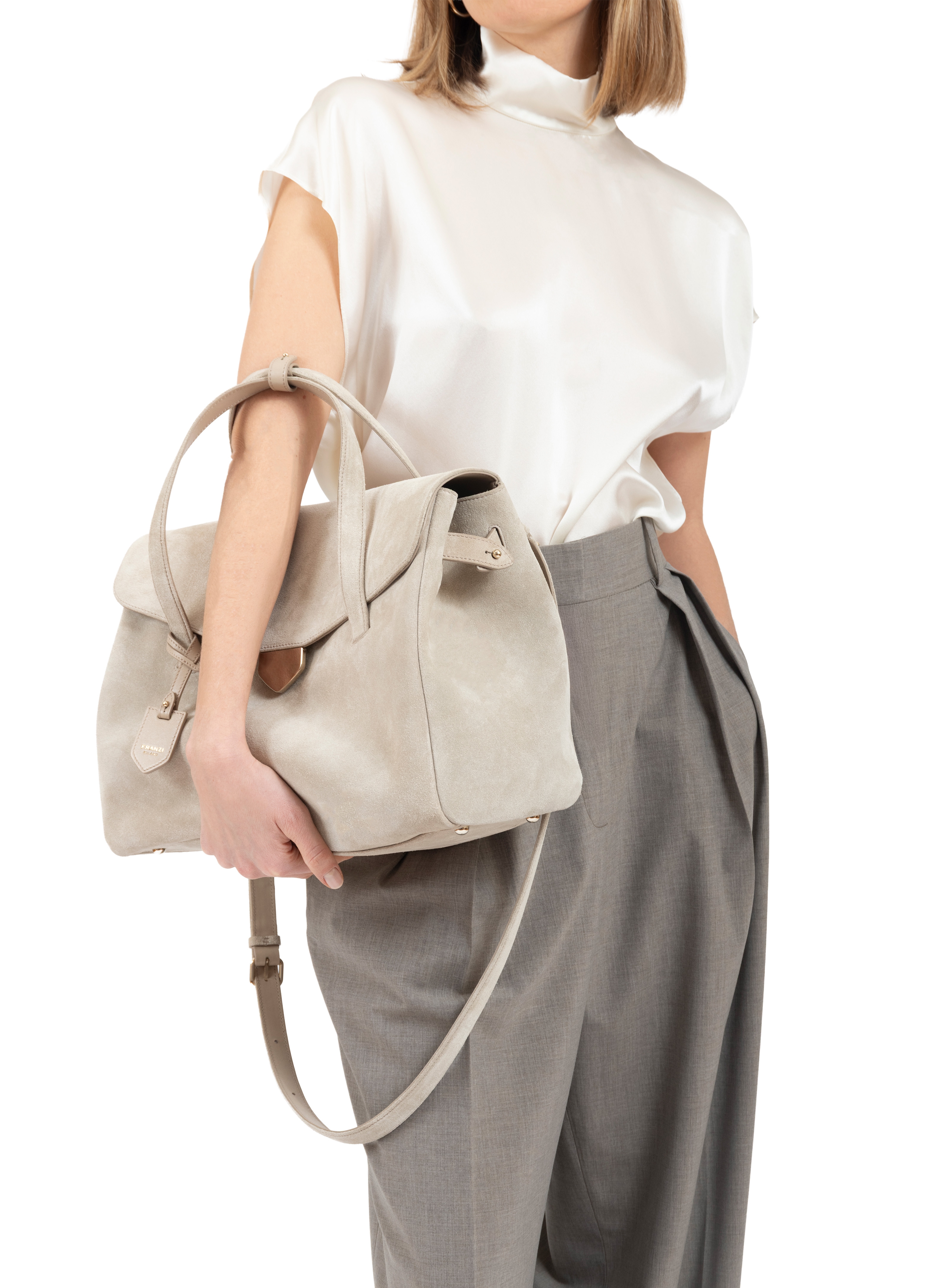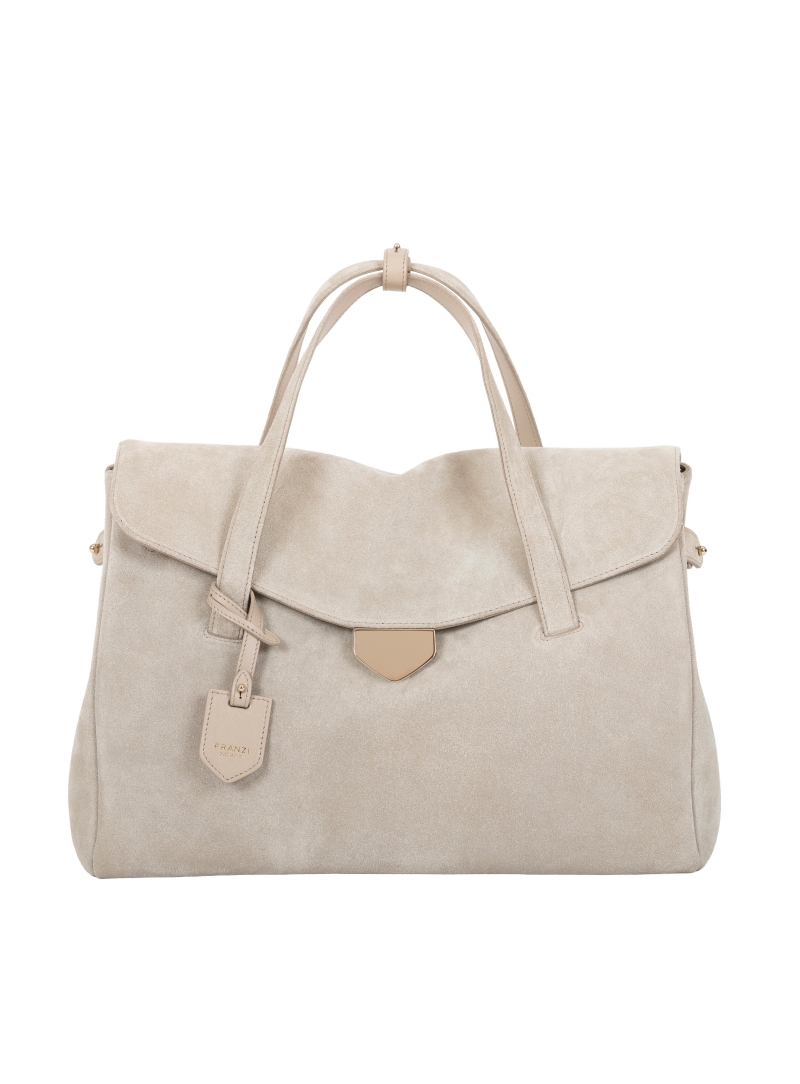 Virginia is Franzi’s Day-Bag dedicated to Virginia Oldoini, a prominent 19th-century figure remembered for her influence on the political landscape of her time—so much so that she became known as the “Empress without an Empire.” Crafted from exceptional soft Suede with a velvety touch and available in a refined Grey Sand hue, Virginia features a deconstructed design built around a single focal point: a signature metal clasp shaped like a spur tip. Two external side straps allow the bag’s capacity to expand, making it the perfect choice for the modern woman who values functionality without compromising on sophisticated femininity. The central compartment, lined in a linen and cotton blend, is organized with two spacious semi-flat pockets. To further enhance its practicality, the bag includes a removable zipped pouch, also lined in linen and cotton and finished in matching Franzi leather, which attaches to the interior via two snap buttons. A zipped back pocket discreetly conceals the attachments for the adjustable shoulder strap, allowing Virginia to be worn on the shoulder or cross-body—adding to its versatility and everyday appeal. A customizable leather tag, echoing the brand’s aesthetic codes, completes the design. Each piece is presented in an elegant Franzi green box, carefully sealed with a shiny ribbon. The bag comes with its certificate of authenticity and care instructions, including guidance for attaching the shoulder strap.