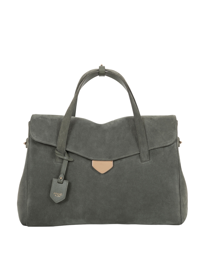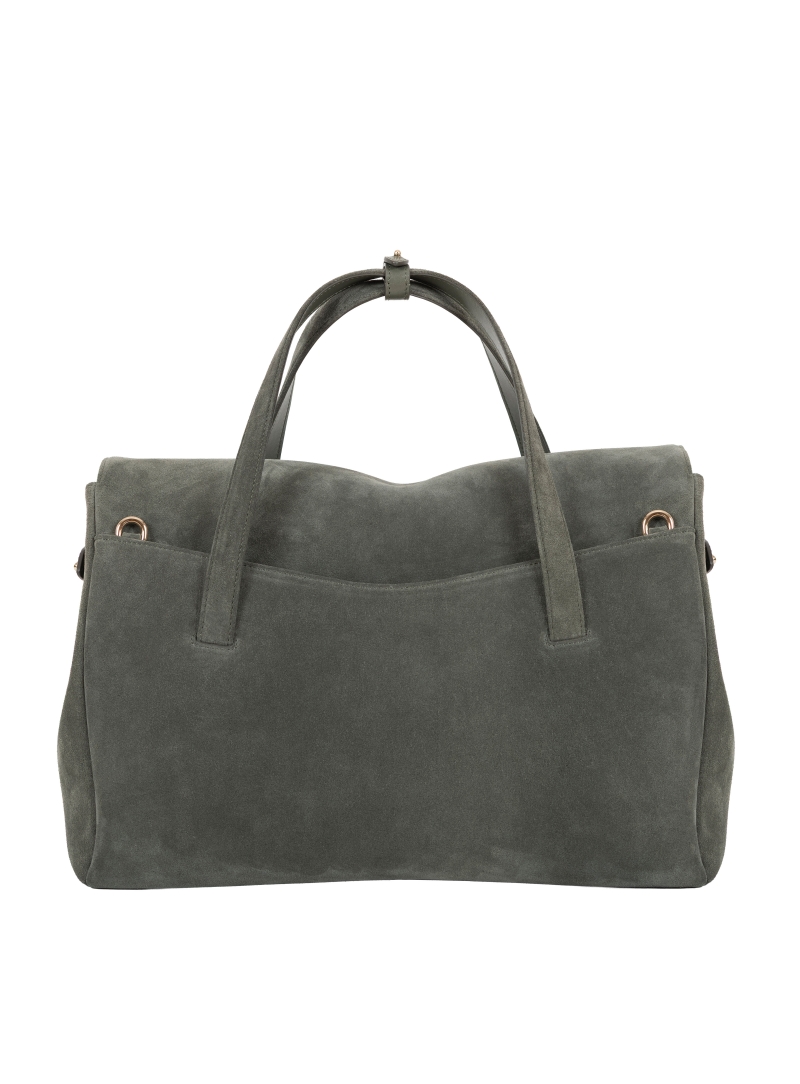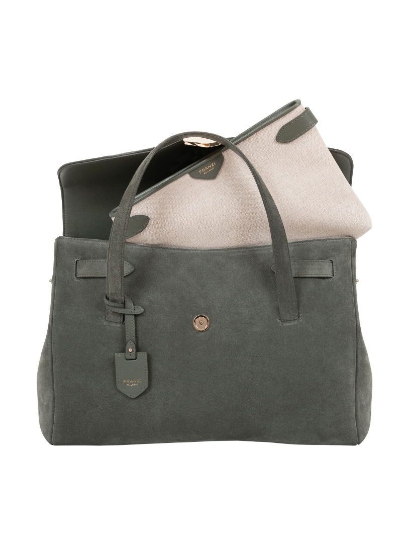 Virginia is Franzi’s Day-Bag dedicated to Virginia Oldoini, a prominent 19th-century figure remembered for her influence on the political landscape of her time—so much so that she became known as the “Empress without an Empire.” Crafted from exceptional soft Suede with a velvety touch and available in a refined Smoky Green hue, Virginia features a deconstructed design built around a single focal point: a signature metal clasp shaped like a spur tip. Two external side straps allow the bag’s capacity to expand, making it the perfect choice for the modern woman who values functionality without compromising on sophisticated femininity. The central compartment, lined in a linen and cotton blend, is organized with two spacious semi-flat pockets. To further enhance its practicality, the bag includes a removable zipped pouch, also lined in linen and cotton and finished in matching Franzi leather, which attaches to the interior via two snap buttons. A zipped back pocket discreetly conceals the attachments for the adjustable shoulder strap, allowing Virginia to be worn on the shoulder or cross-body—adding to its versatility and everyday appeal. A customizable leather tag, echoing the brand’s aesthetic codes, completes the design. Each piece is presented in an elegant Franzi green box, carefully sealed with a shiny ribbon. The bag comes with its certificate of authenticity and care instructions, including guidance for attaching the shoulder strap.