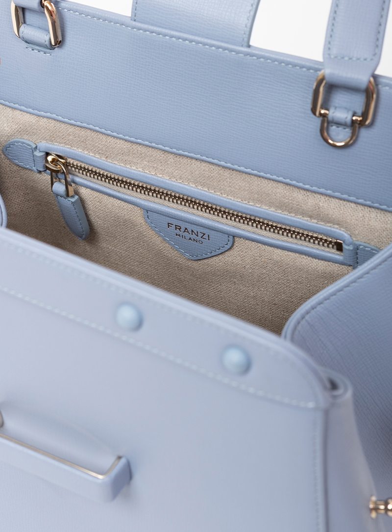 Camilla conserva gli elementi stilistici del marchio, ripresi dal mondo della valigeria, come la chiusura a puntale in pelle o la barra con i rivetti rivestiti. I due lembi laterali esterni, se aperti, rendono la borsa destrutturata e ancora più capiente, per adattarsi alle necessità di una donna attiva e impegnata. Foderata con il celebre pattern del marchio, Camilla è organizzata internamente con 2 tasche semi-piatte e una con chiusura a lampo. La maestria tecnica e la cura per il dettaglio, che contraddistinguono ogni creazione Franzi, hanno dato vita a un modello estremamente leggero e pratico per un utilizzo quotidiano, indossabile a mano, al braccio e cross-body, grazie alla tracolla in pelle regolabile.