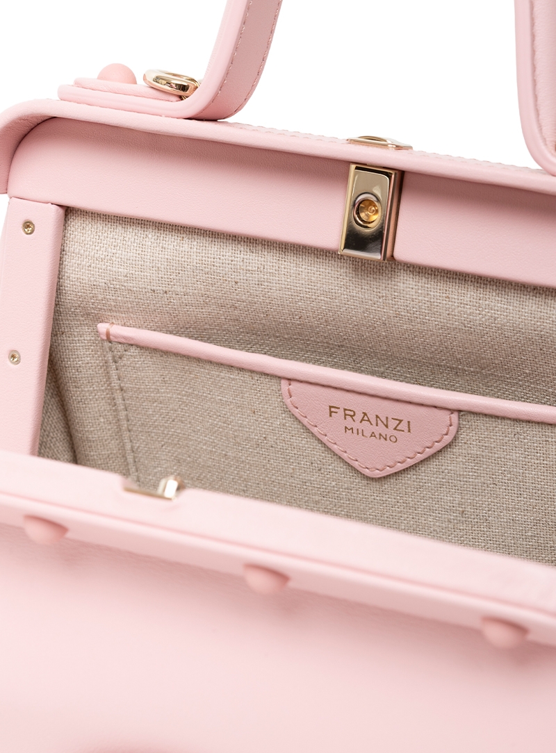 Ciascuna creazione viene inserita in un’apposita custodia antipolvere e consegnata in un’elegante scatola verde Franzi, accuratamente sigillata da un nastro di raso brillante. Ogni borsa arriva accompagnata dal suo certificato di autenticità e dalle istruzioni per il suo mantenimento e per il montaggio della tracolla.