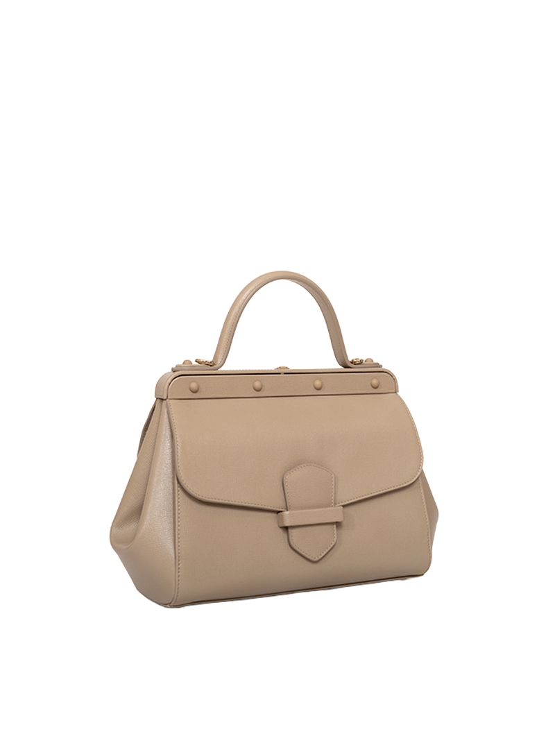 Concepita per la donna moderna, è una borsa dalle linee eleganti e sinuose che trae ispirazione dal mondo dei viaggi, ricordati dalla chiusura a puntale e dalla barra con i rivetti, ma con un'anima fresca e contemporanea.
